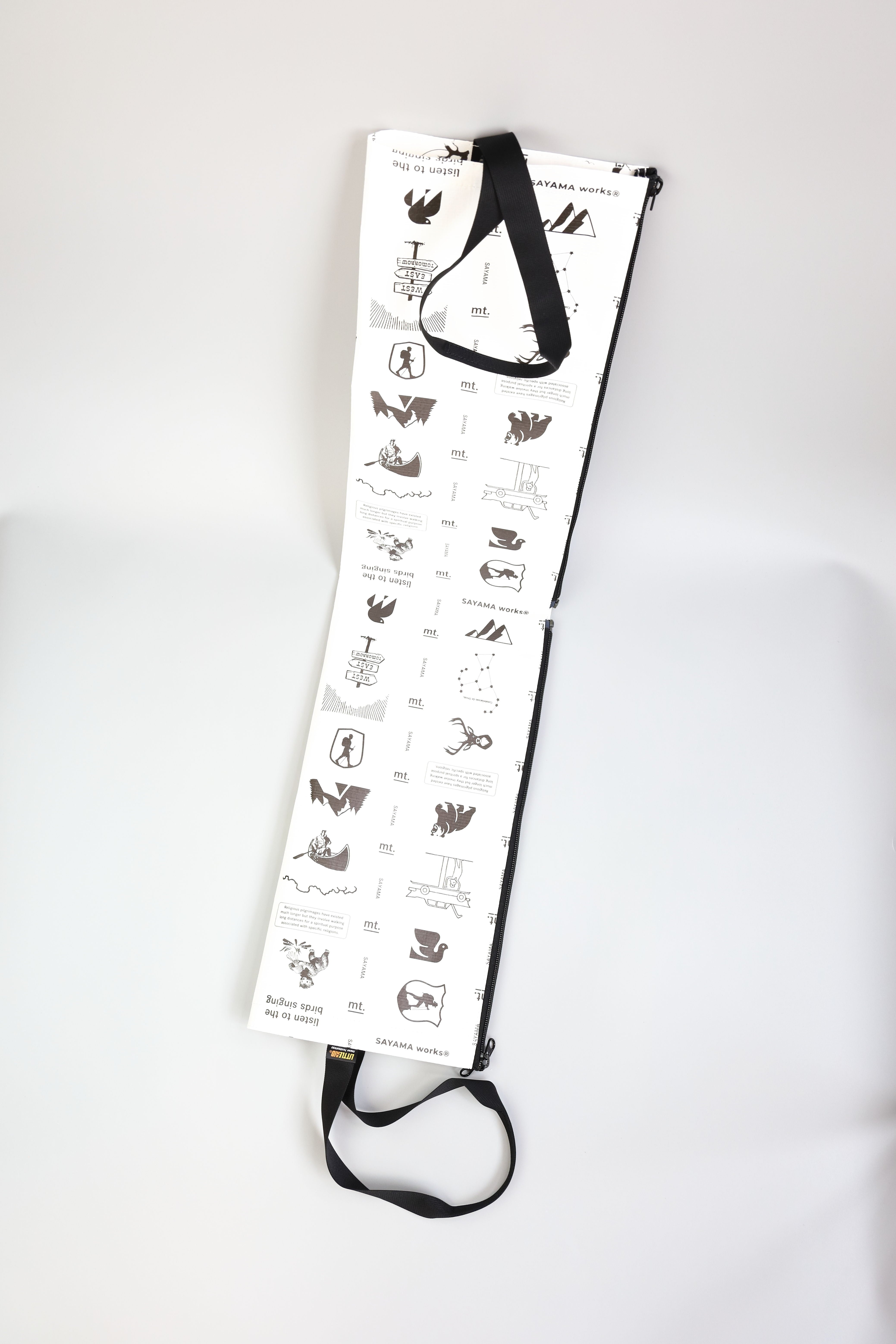 ジェリー鵜飼氏を総柄デザイナーとして迎え入れた後、JUicy seriesの一つとして 「登山や日常でも使える総柄プリント入りのレジャーシート」を開発・販売したいと考えていました。当初はタイベックシートを考えていたのですが、耐久性・耐水圧が低いのがデメリットでした。またタイベックにプリントした商品は他のメーカーでも販売しており、 弊社が販売してもユーザーは面白くないだろうというのが正直なところでした。その後も代替え・革新的なアイデアはないものかと悩んでいたところ、レジャーシートとトートバッグを一つの商品にできないかと考えました。その後、総柄プリント可能な高耐久防炎シートがあると知り、それに総柄プリントを施し、JUicy Sheetが完成致しました。