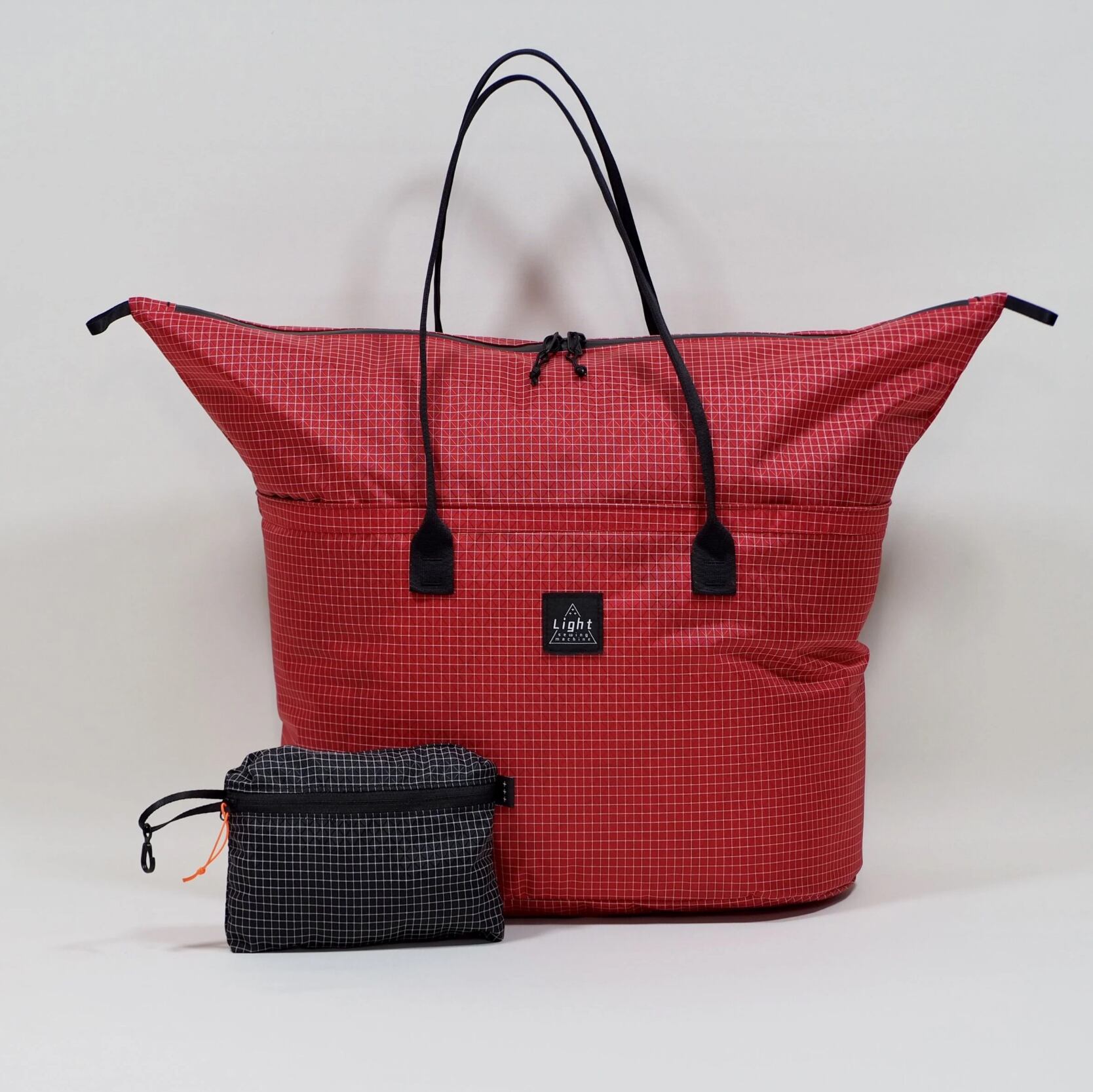 tool tote.は山行の際のサブギア収納バッグとして、旅行の際のメインバッグとして様々な方の使用レビューにより少しずつブラッシュアップされたモデルです。そしてtool tote+はより収納容量やコンパクト性を求める意見から生まれた新しいコンセプトのモデルです。またtool tote+では新たに吹き流し部分をロールトップ式からYKK®のAquaGuard®NATULON® 5Cサイズをダブルスライダー仕様にする事で、容量ギリギリまで収納可能にしました。本体切り替え部分のコードパイピングはバッグ全体のソフトボーンの役割を成しバッグの形状や収納時のヘタりを抑える効果があります。上部ファスナーに向かって鋭角なラインを描く事で、ファスナーを全開にした時に荷物を出し入れしやす内部を見やすくする底面横幅と同サイズになっています。
