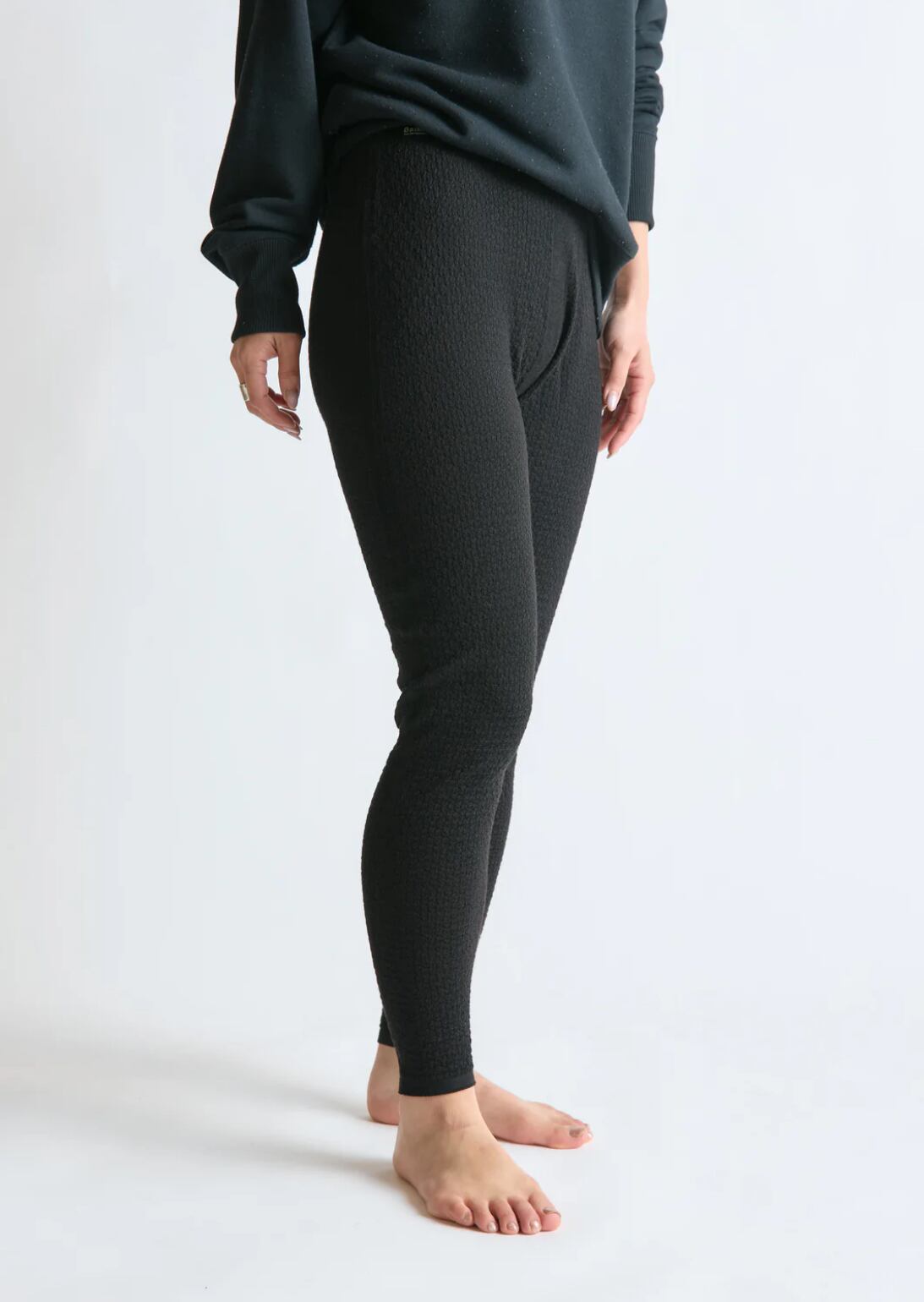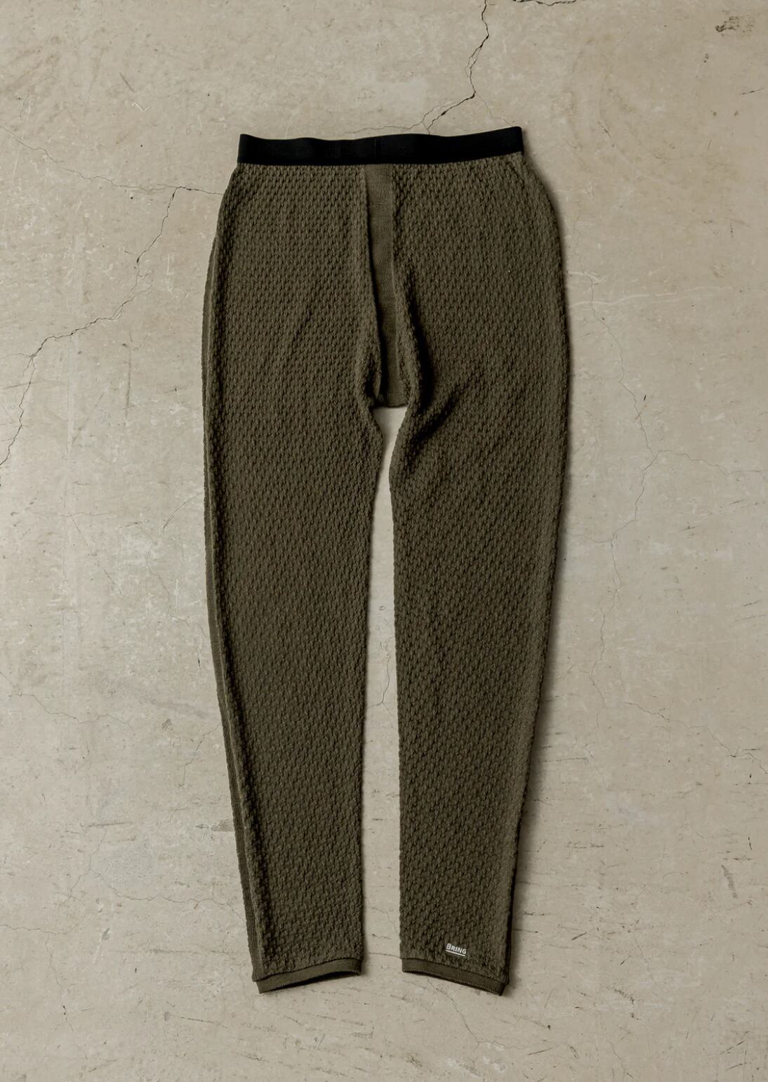 ワンダーウェアと同素材のレギンスです。ワンダーウェアと比較すると股上が深めに作られているので、ワンダーウェアや他のアンダーウェアの上に穿くこともできます。ハイキング、登山を想定し、メリノウール70%、再生ポリエステル30%の混紡で保温性を高めました。ウエストは平ベルトでしっかりとホールドし、ずり落ちを防ぐので1枚で穿いても安心です。