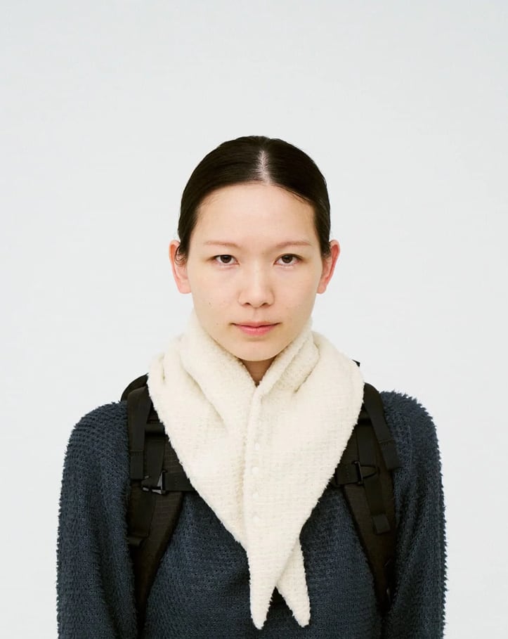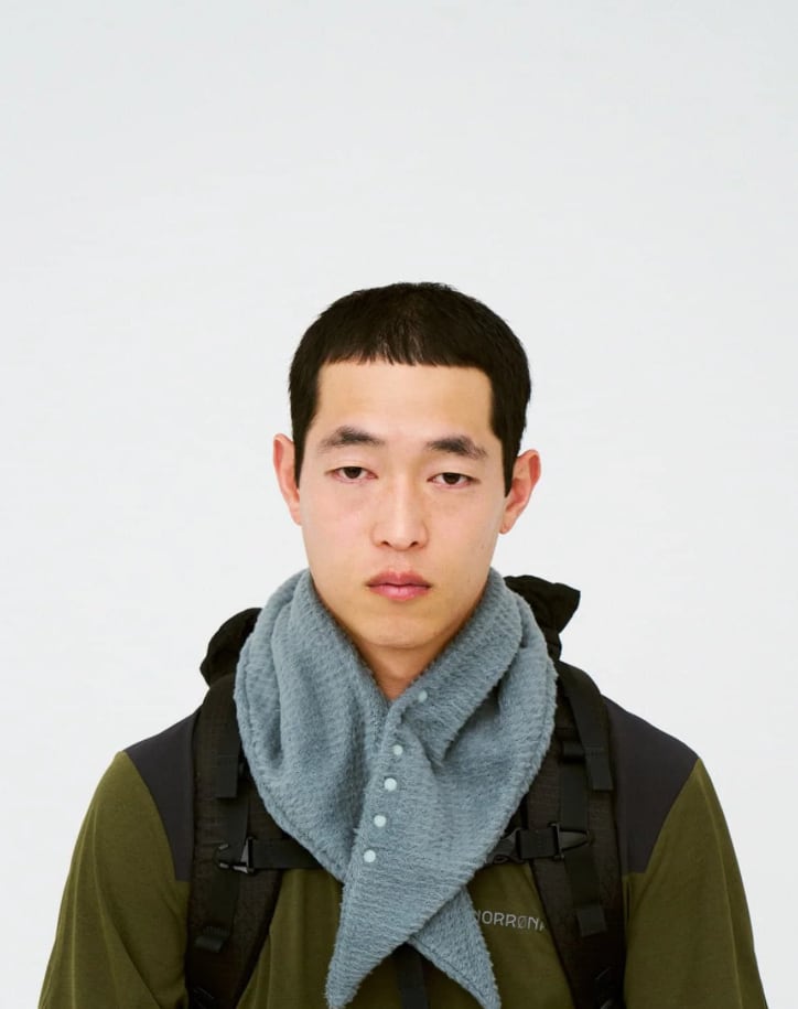 通気性と保温性に優れた**POLARTEC® ALPHA DIRECT®**を使用した三角ストール。